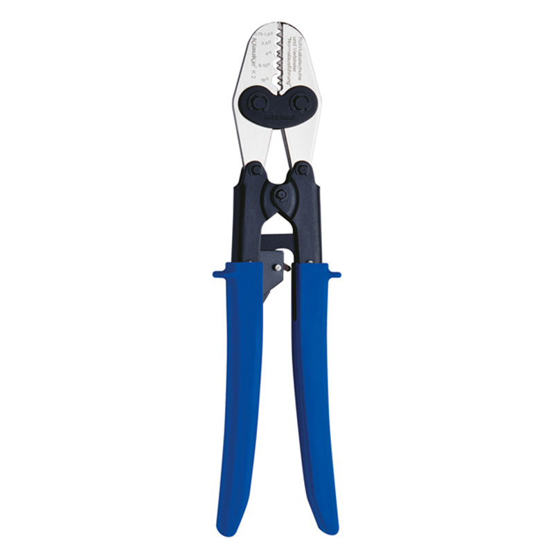 The K2 is a crimp tool designed for use with 0.75 to 16mm² standard type tubular cable lugs and connectors. It is the ideal hand crimping tool with spring supported tool opening.